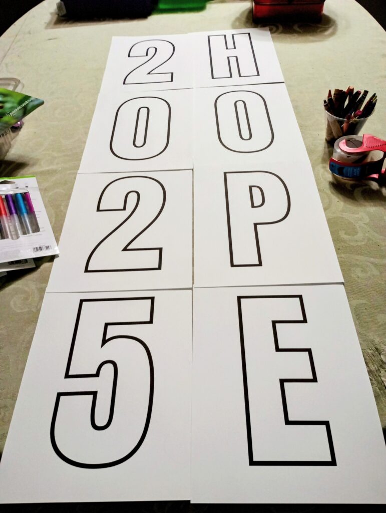- Tape the pages together vertically as shown below OR, if you prefer, you can tape them horizontally instead. Then, tape the full banner to a door, wall, window, or wherever you will see it daily. Ours is on a bedroom door.